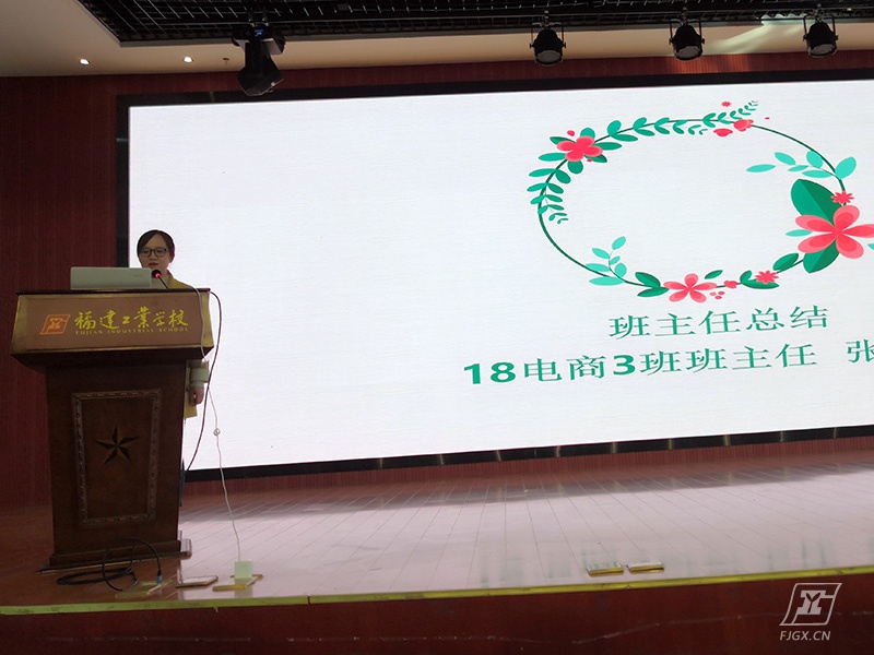 18电商3班的张志宏老师代表班主任团队上台分享了自己的带班心得。她从班委管理、班级活动、学生的成长几个方面,讲出了班主任们的心声。接下来,洪紫如老师上台做了总结性发言。她回顾了一个学期以来经贸专业教学部在学生管理方面的工作:班主任互助小组学习交流助力班主任团队建设;文化布置上墙,提升劳动卫生标准,营造优美温馨的学习环境;两委班委队伍培训提升战斗力;活动开展寓教于乐等。最后她结合学习小组工作的开展,分享了关于“读书是为了什么”,为下学期的学业水平考试作动员。