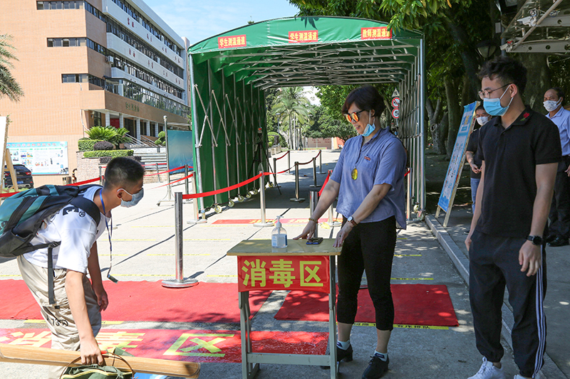 本批返校学生近2000名,返校学生在工作人员的引导下,按照学校多次演练的返校流程有序进校,报到现场井然有序。当天一早,学生陆续进校,校门口设置了“重重关卡”,设置等候线,划分消毒、测温通道。学生们戴着口罩有序排队等候,通过测量体温、核验身份、查验健康码、人身行李消杀,符合条件、体温正常的学生方可入校。